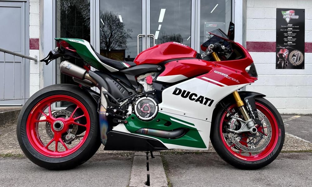 Ducati 1299 Panigale R Final Edition, stunning tricolore paint scheme. This bike has been fitted with the Akrapovic complete titanium exhaust system, Ducati tail tidy, CNC rearsets, slave cylinder and levers. Ducabike clear clutch cover, Rizoma stealth mirrors, Powerbronze screen and PPF protection.